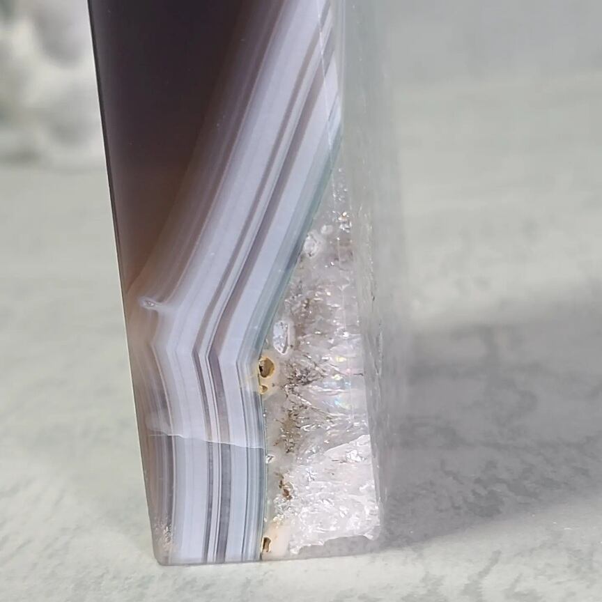 ぜひ、キラキラの結晶やアゲートの美しさ、所々にあらわれる虹の輝きをじっくり眺めてみてください。