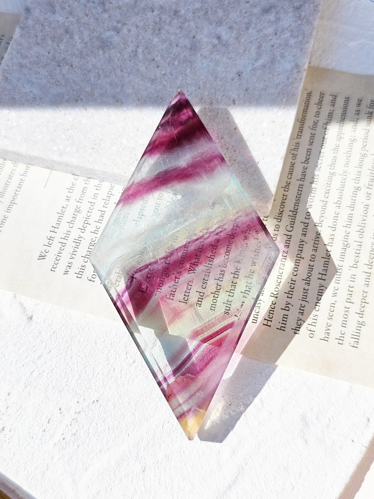 癒しと集中力を与えてくれ、ストレスの解放にも良いとされるフローライトをダイヤ型にカットしたもので、素晴らしい透明感があります。
