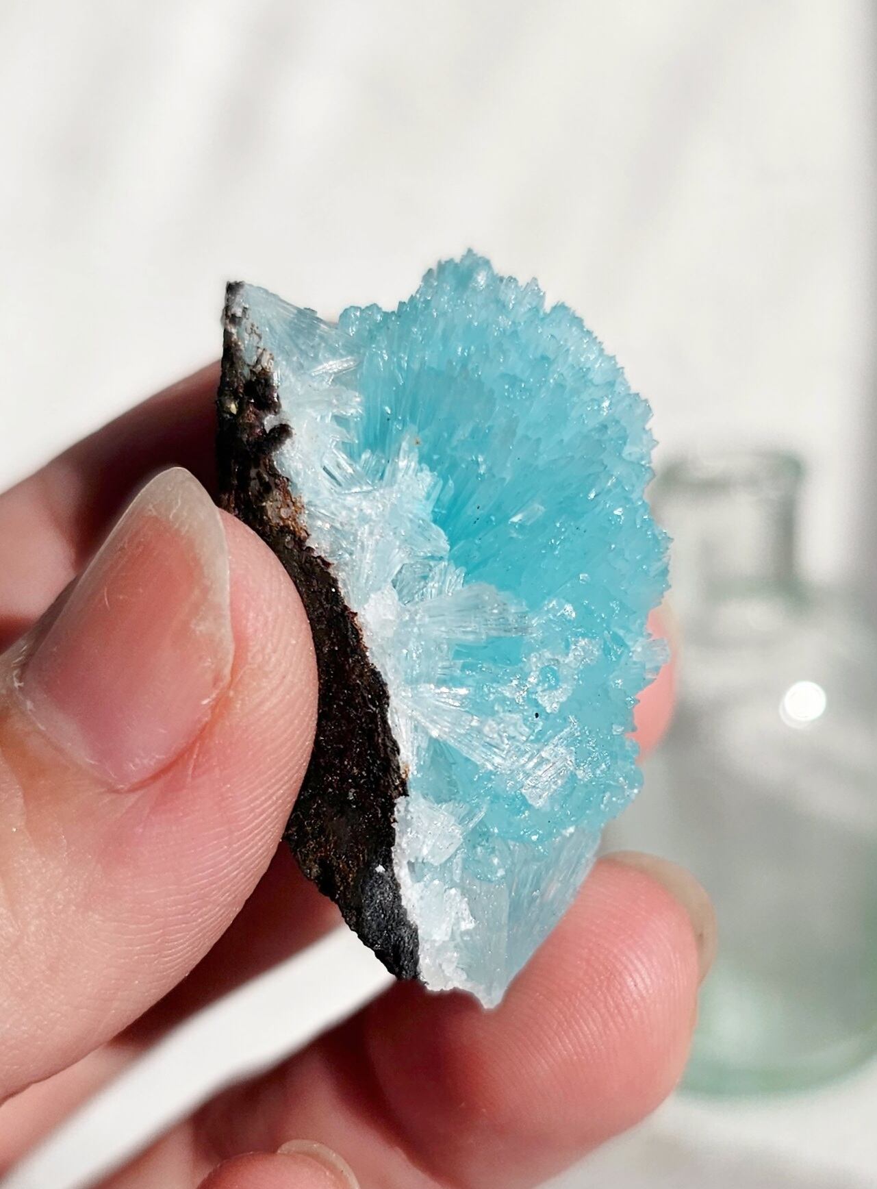 爽やかで澄んだスカイブルー、海の色を思わせるブルーエメラルド、どちらにも見えるとても美しい結晶です。